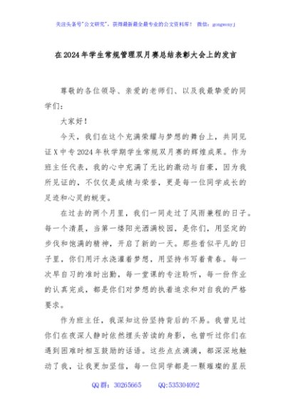 / 在2024年学生常规管理双月赛总结表彰大会上的发言
