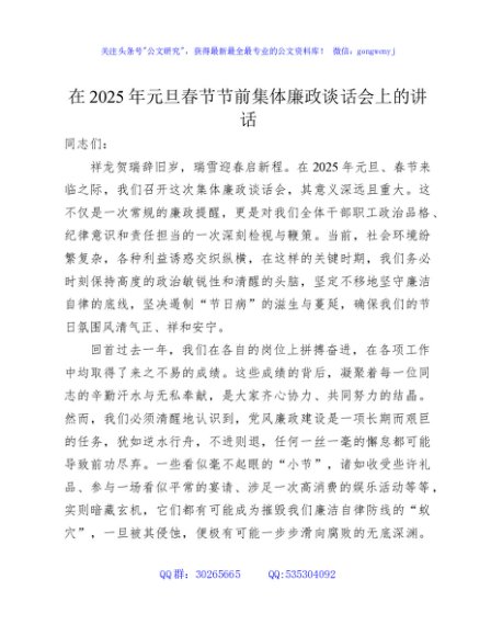/ 在2025年元旦春节节前集体廉政谈话会上的讲话