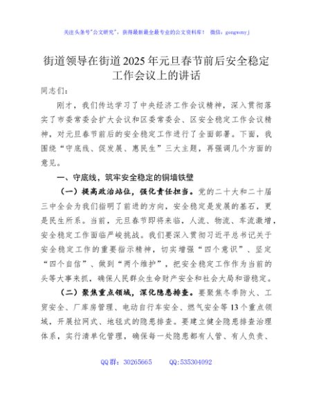 / 在街道2025年元旦春节前后安全稳定工作会议上的讲话
