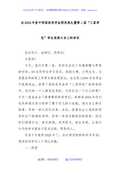 / 在2024年度中职国家奖学金颁奖典礼暨第二届“三星两优”学生表扬大会上的讲话