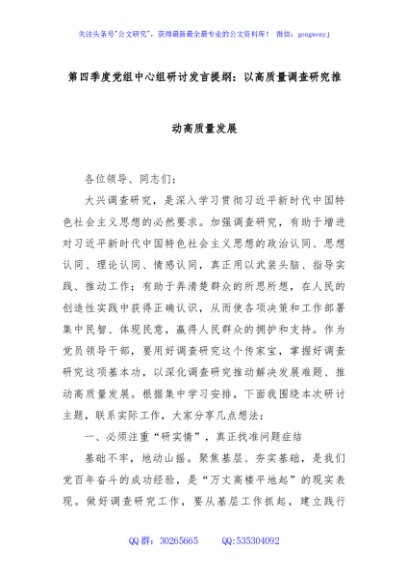 / 第四季度党组中心组研讨发言提纲:以高质量调查研究推动高质量发展