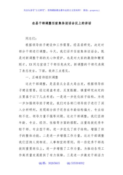 / 在县干部调整任前集体谈话会议上的讲话
