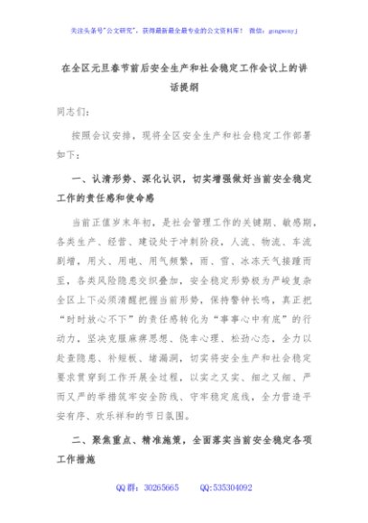 / 在全区元旦春节前后安全生产和社会稳定工作会议上的讲话提纲
