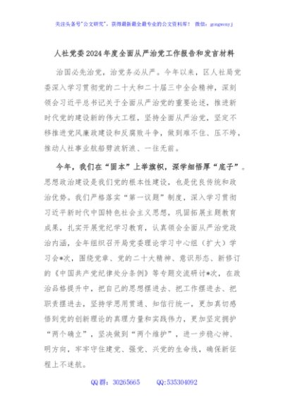 / 人社党委2024年度全面从严治党工作报告和发言材料