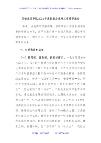 / 某镇党委书记2024年度抓基层党建工作述职报告