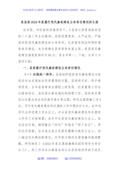 / 某县委2024年度履行党风廉政建设主体责任情况的汇报
