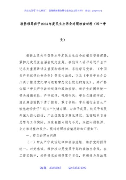 / 政协领导班子2024年度民主生活会对照检查材料(四个带头)