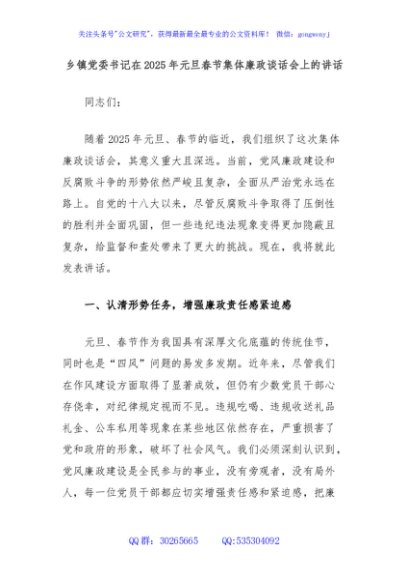 / 乡镇党委书记在2025年元旦春节集体廉政谈话会上的讲话