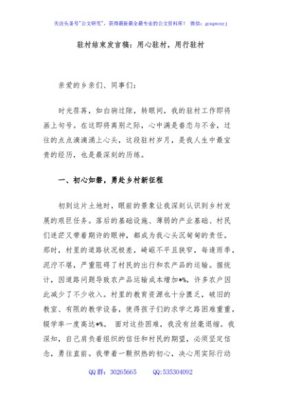 / 驻村结束发言稿:用心驻村,用行驻村