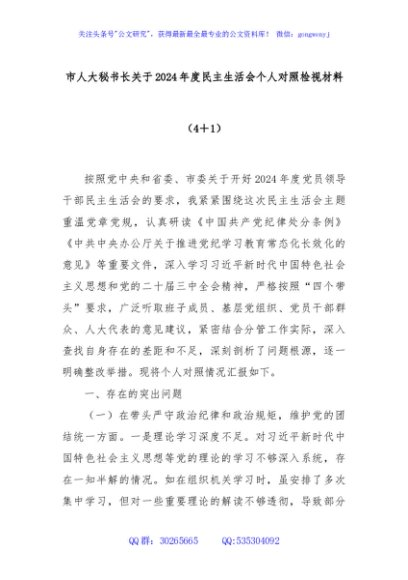 / 市人大秘书长关于2024年度民主生活会个人对照检视材料(4+1)