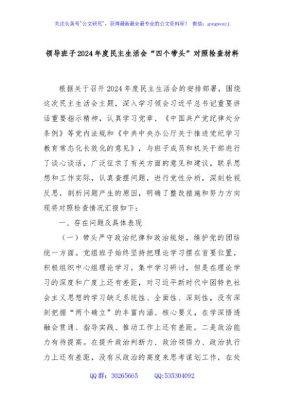 / 领导班子2024年度民主生活会“四个带头”对照检查材料