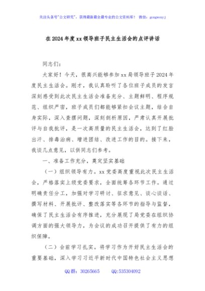 / 在2024年度xx领导班子民主生活会的点评讲话