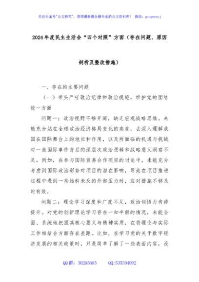 / 2024 年度民主生活会“四个对照”方面(存在问题、原因剖析及整改措施)