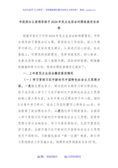 / 市政府办公室领导班子2024年民主生活会对照检查发言材料