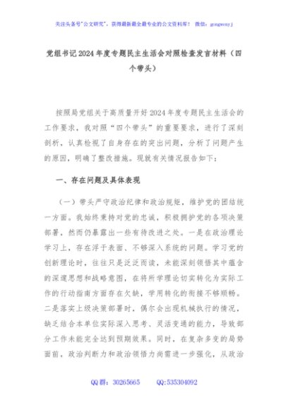 / 党组书记2024年度专题民主生活会对照检查发言材料(四个带头)