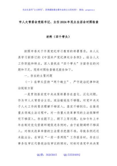 / 市人大常委会党组书记、主任2024年民主生活会对照检查材料(四个带头)