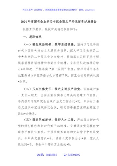 / 2024年度国有企业党委书记全面从严治党述责述廉报告