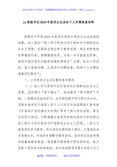 / xx党组书记2024年度民主生活会个人对照检查材料