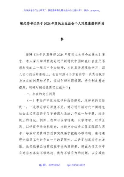 / 镇纪委书记关于2024年度民主生活会个人对照查摆剖析材料