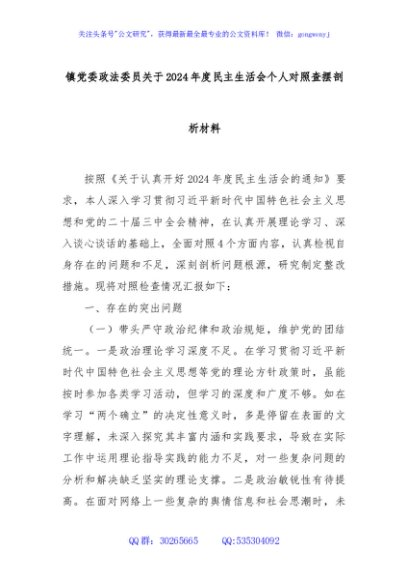 / 镇党委政法委员关于2024年度民主生活会个人对照查摆剖析材料
