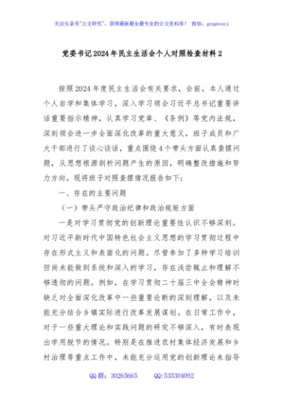/ 党委书记2024年民主生活会个人对照检查材料2