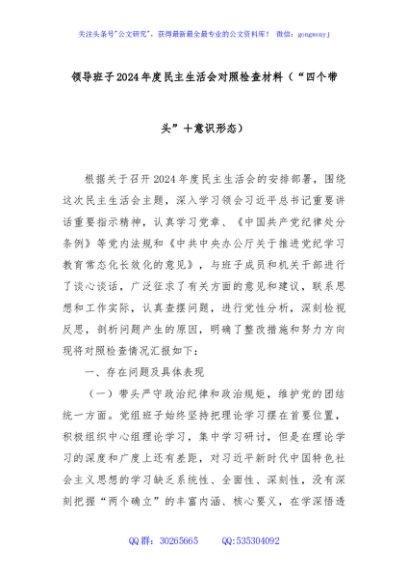 / 领导班子2024年度民主生活会对照检查材料(“四个带头”+意识形态)