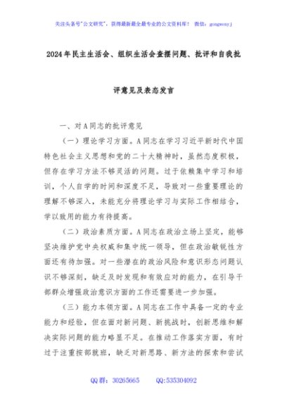 / 2024年民主生活会、组织生活会查摆问题、批评和自我批评意见及表态发言