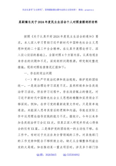 / 某副镇长关于2024年度民主生活会个人对照查摆剖析材料