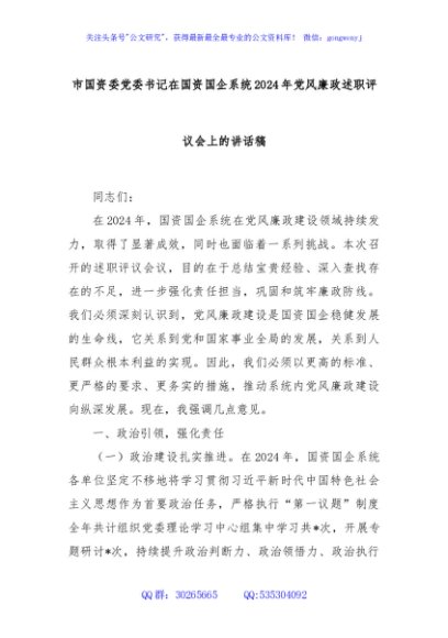 / 市国资委党委书记在国资国企系统2024年党风廉政述职评议会上的讲话稿