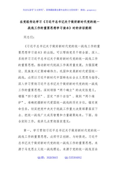 / 在党组传达学习《习近平总书记关于做好新时代党的统一战线工作的重要思想学习读本》时的讲话提纲