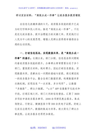 / 研讨发言材料:“高效办成一件事”让政务服务提质增效