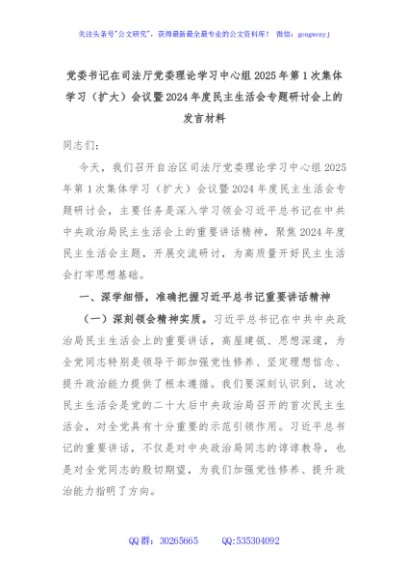 / 党委书记在司法厅党委理论学习中心组2025年第1次集体学习(扩大)会议暨2024年度民主生活会专题研讨会上的发言材料