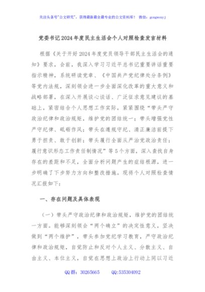 / 党委书记2024年度民主生活会个人对照检查发言材料