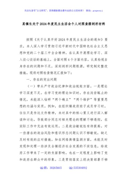 / 某镇长关于2024年度民主生活会个人对照查摆剖析材料