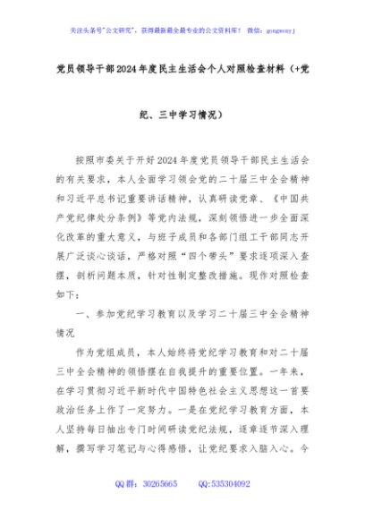 / 党员领导干部2024年度民主生活会个人对照检查材料(+党纪、三中学习情况)