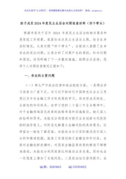 / 班子成员2024年度民主生活会对照检查材料(四个带头)
