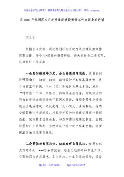 / 在2025年规划区内自建房违规建设整顿工作会议上的讲话