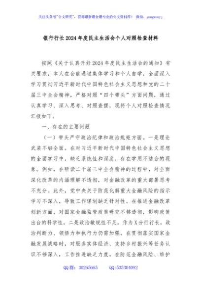/ 银行行长2024年度民主生活会个人对照检查材料
