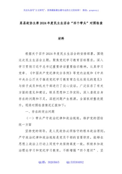/ 某县政协主席2024年度民主生活会“四个带头”对照检查材料