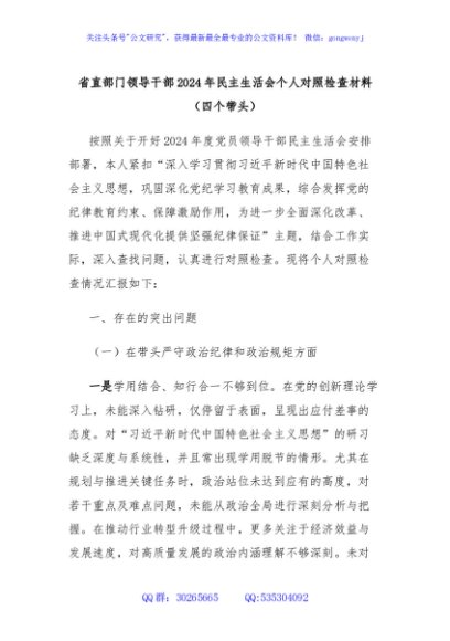 / 省直部门领导干部2024年民主生活会个人对照检查材料(四个带头)