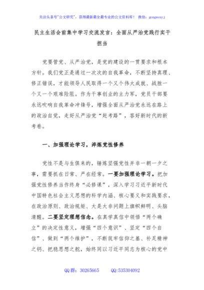 / 民主生活会前集中学习交流发言:全面从严治党践行实干担当