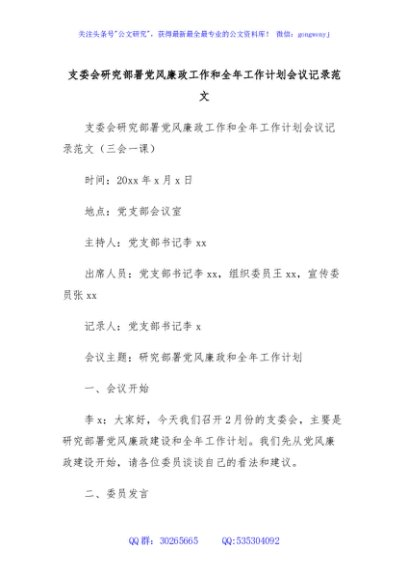 / 支委会研究部署党风廉政工作和全年工作计划会议记录范文