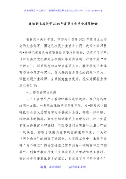 文教卫副市长2024年民主生活会对照检查材料(四个带头)