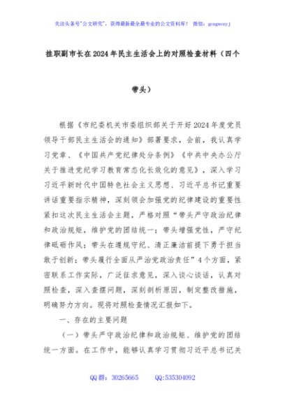 / 挂职副市长在2024年民主生活会上的对照检查材料(四个带头)