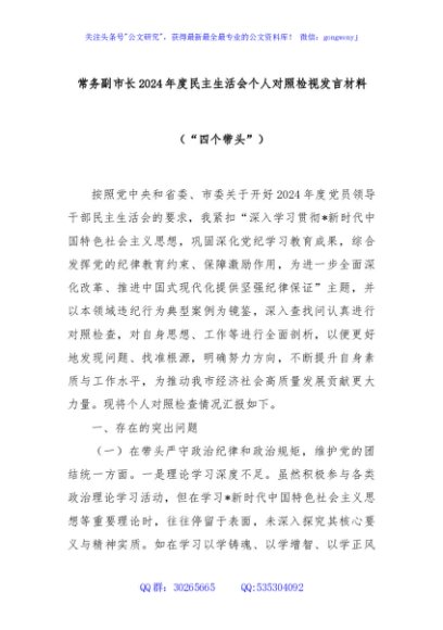 / 常务副市长2024年度民主生活会个人对照检视发言材料(“四个带头”)