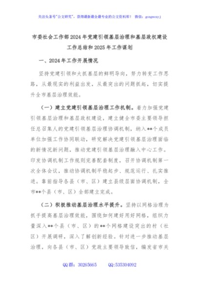 / 市委社会工作部2024年党建引领基层治理和基层政权建设工作总结和2025年工作谋划
