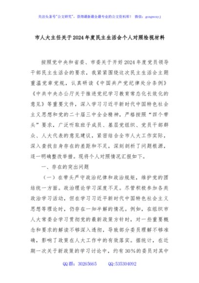 / 市人大主任关于2024年度民主生活会个人对照检视材料