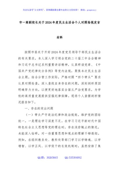 / 市一高副校长关于2024年度民主生活会个人对照检视发言材料