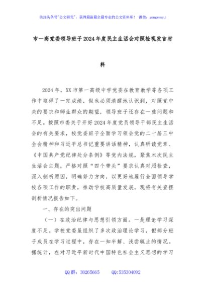 / 市一高党委领导班子2024年度民主生活会对照检视发言材料