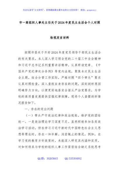 / 市一高组织人事处主任关于2024年度民主生活会个人对照检视发言材料